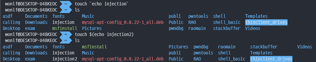 ``과 $()로 사용할 수 있고 문자 안에 있는 명령어를 실행한 결과로 값이 치환 되는 것인데, 차이점으로는 $()를 사용하면 중복으로 사용할 수 있다는 것이다.