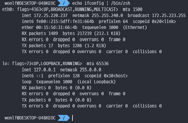ifconfig 문자열을 /bin/zsh를 실행한 뒤에 입력하여 ifconfig 리스트가 출력된것이다.