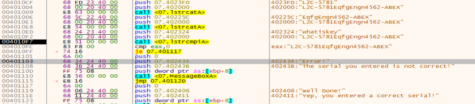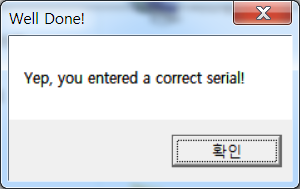 아래 구문은 정말 쉽게도 특정 주소에 있는 값과 위에서 여러가지 방법으로 변환한 문자열을 합치고, 입력한 값과 비교하여 키인지 아닌지 판단하는 구문으로 되어 있다. 그래서 저기 적혀있는 시리얼로 추정되는 문자열을 입력해주면