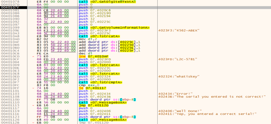 GetVolumeInformationA 함수를 실행시키니, 40225C 주소에 C드라이브의 이름인 "CodeEngn"이 저장되었다. 더 내려가본다.