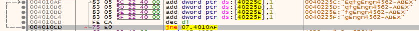 add를 하기 전, mov dl, 2 구문이 있었다. dl안에는 2가 들어있고 add 4번이 지나고 난 뒤에 dec명령어로 1로 만들었다 ZF는 계속 0이고 JNE에서는 ZF가 0이니 특정 주소로 점프를 하게 되니까 add 4번을 하는 주소로 점프하게 된다. 즉 for문 같은 행위라는것. 그래서 2번 add를 하게 되면.