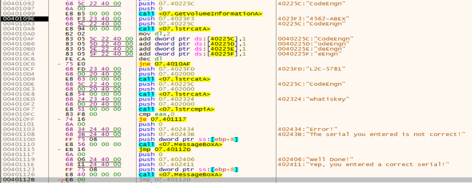 GetVolumeInformationA 함수를 실행시키니, 40225C 주소에 C드라이브의 이름인 "CodeEngn"이 저장되었다. 더 내려가본다.