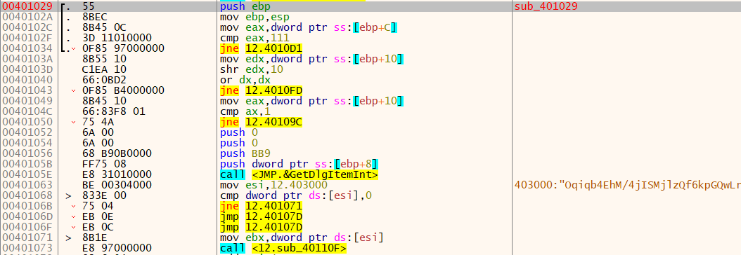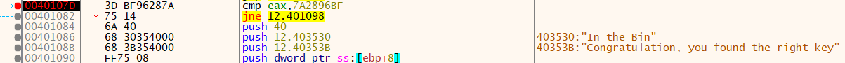 여러가지 구문들이 있지만, 성공 문자열 위에 있는 CMP구문이 의심스럽다. eax에 뭐가 들어가는지 브레이크 포인트를 걸고 확인해본다.
