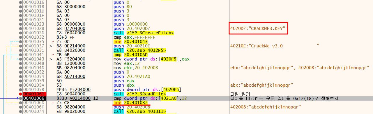 한줄씩 실행시키다 보면, CreateFileA과 ReadFile로 파일을 읽고 있다. "CRACKME3.KEY" 라는 파일을 읽어서 그 안에 있는 내용이 0x12(18)길이가 아니면 다른 곳으로 점프를 한다.