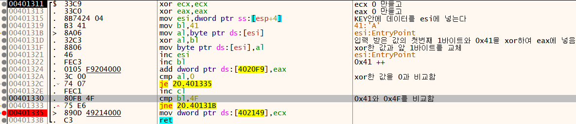 이 구문들을 해석해보면, (KEY[0] ^ 0x41) + (KEY[1] ^ 0x42) + (KEY[2] ^ 0x43).... 이런식으로 진행되는데, 0x4E까지 실행된다. 구문이 끝나고 inc bl이 되고 비교하니까 0x4F가 아닌 0x4E까지만 도는 것이다.